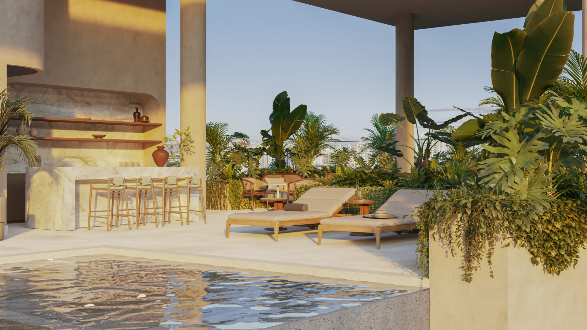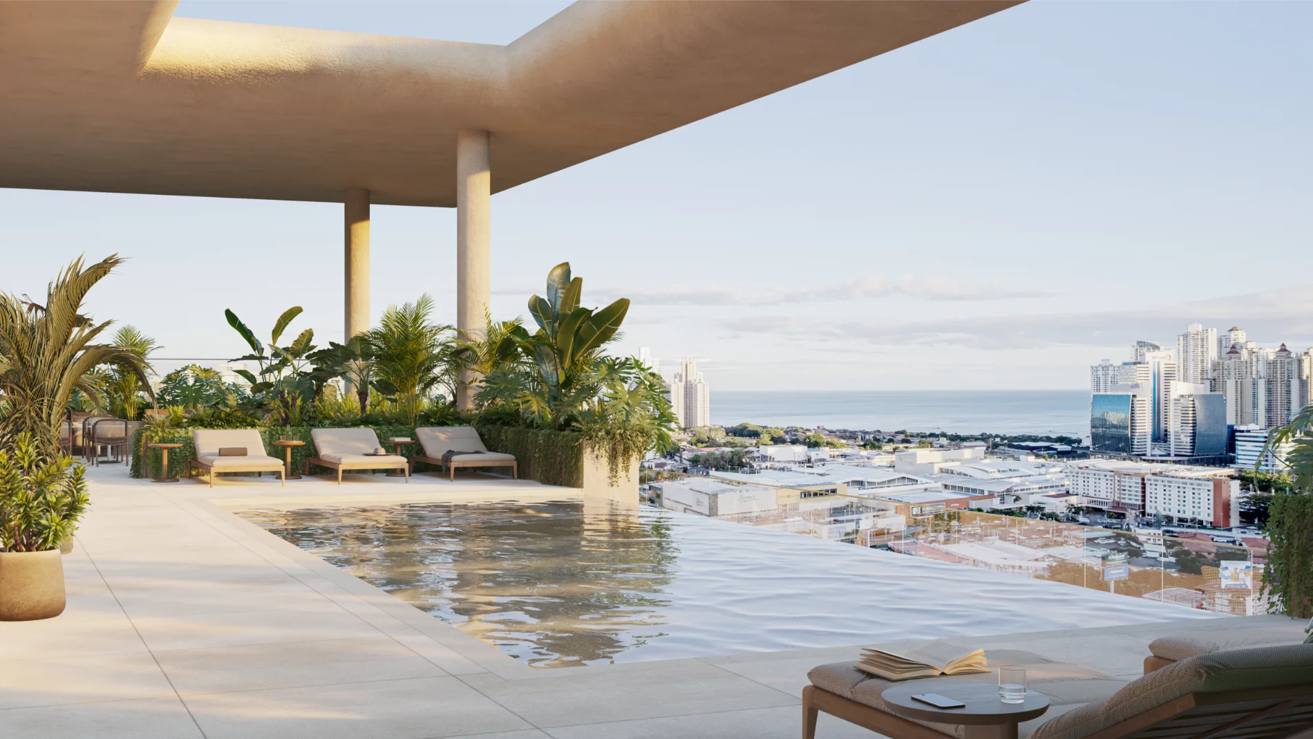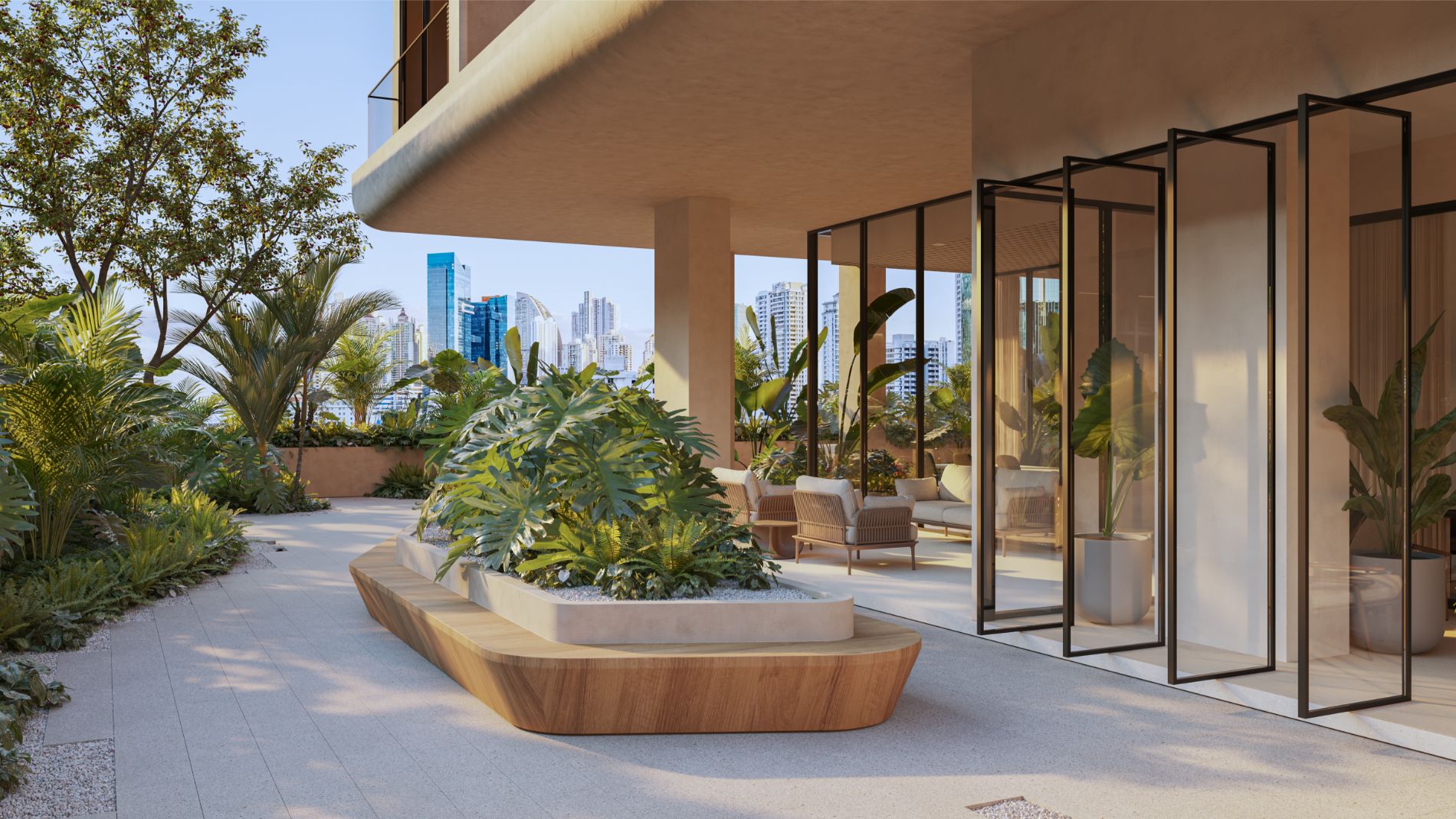 La vista abierta, la vegetación integrada y la luz natural convierten cada espacio común en una extensión del hogar.